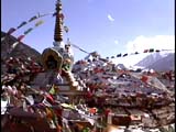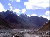 買い求めた地図にはロタン峠を越えるとガランプー、チャトル、チョータダラー、バタルと地名が書いてあるが全く人家が見当たらない。チョータダラーにあるのは二三軒の石積みの壁にビニールシートやテントの簡単な屋根を張っただけの茶店があるだけだ。冬になると、このあたりは人が去って無人地帯になるのだろう。チョータはヒンズー語で狭いという意味だ。なるほど、まわりは石ころだらけの岩山が迫った道が続く。草木も生えない荒涼とした景色を眺めながらバタルをすぎて坂道を登ってゆくと、やがてタルチョがはためくチョルテンが見えてきた。標高4551メートルのクンザン峠だ。さすがに頭が締め付けられるように重い。富士山は3776メートルだからそれよりも遙かに高い。日本では味わえない高さだ。